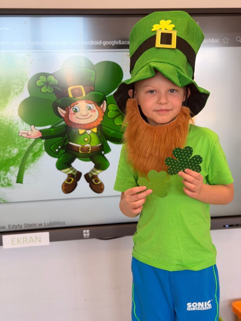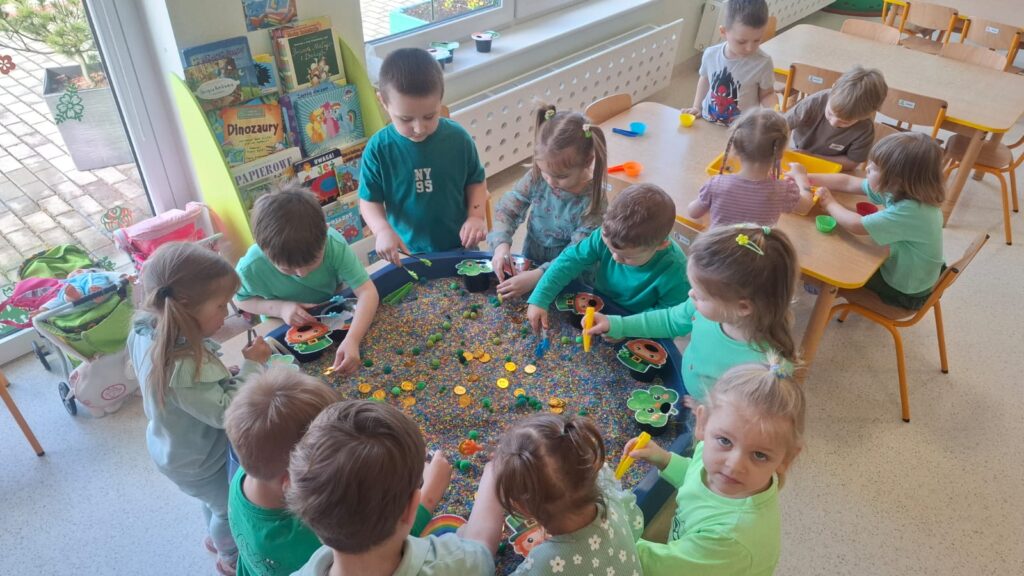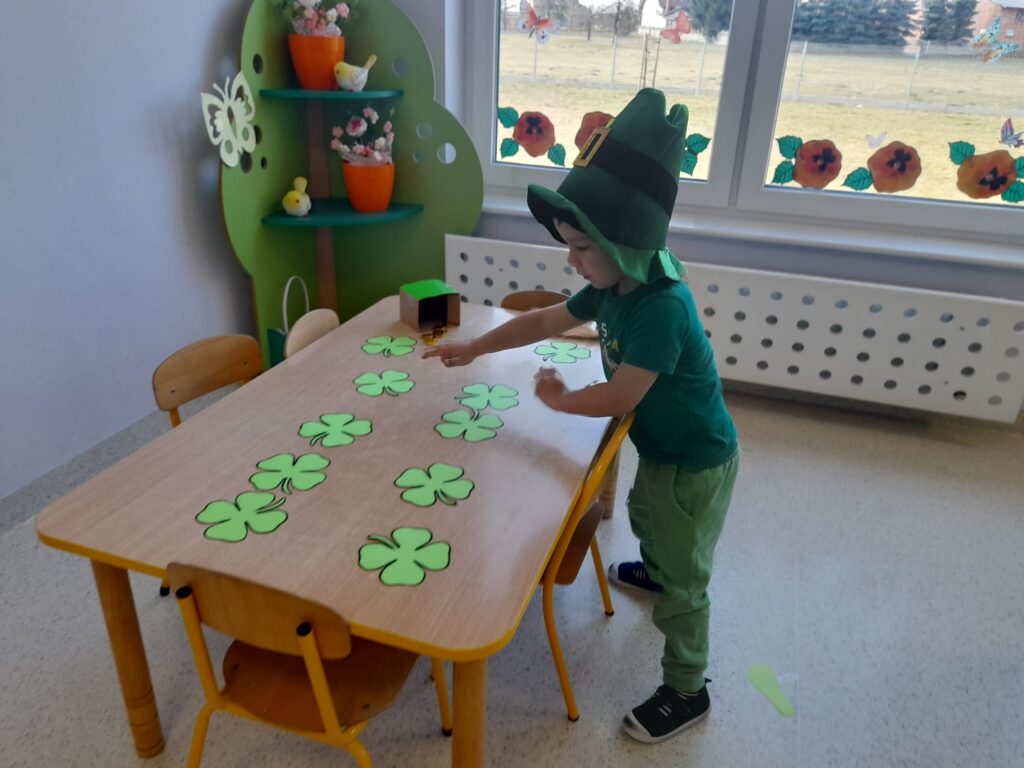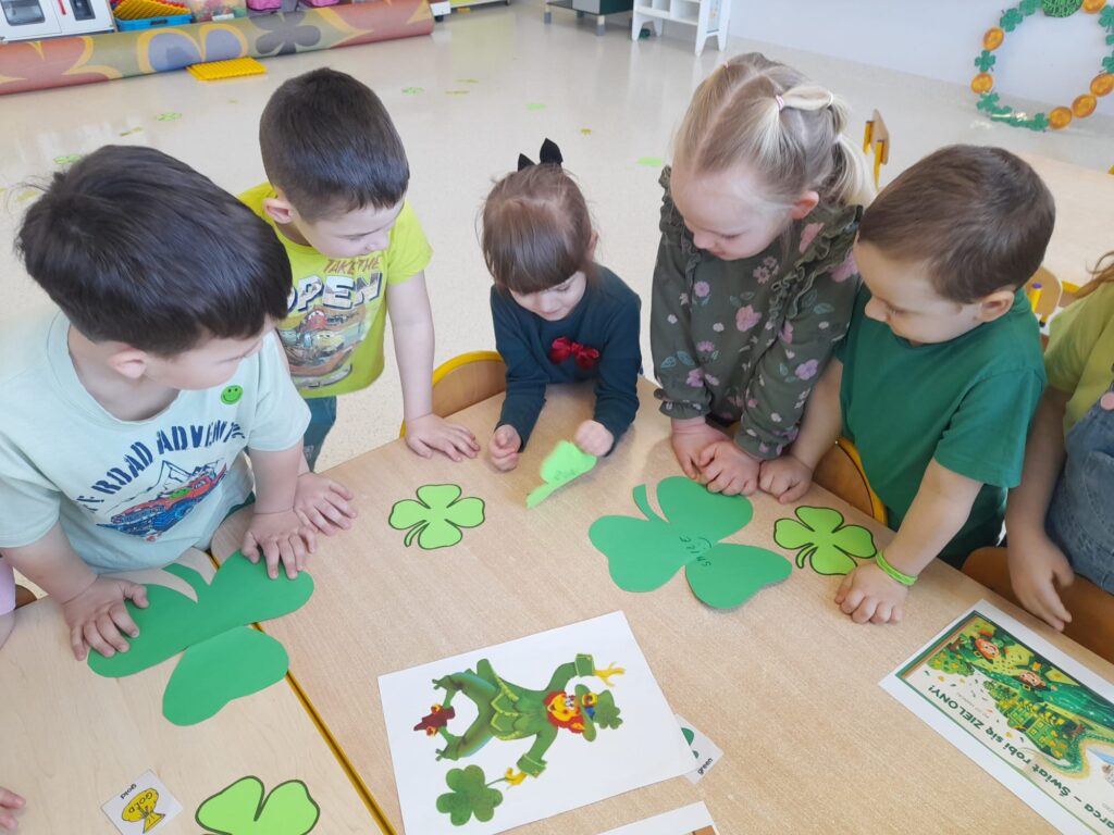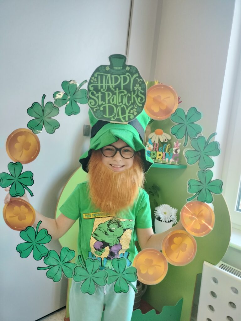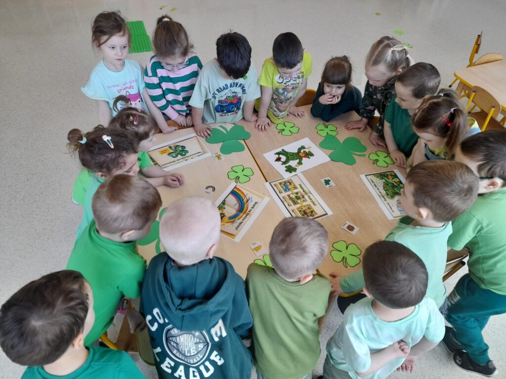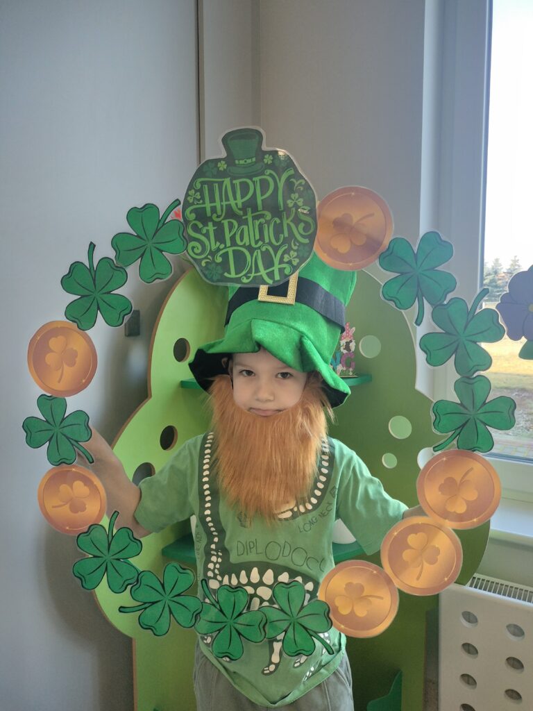 Dziś w przedszkolu wszystko jest zielone! W ramach innowacji Play with English przenieśliśmy się do jednego z najbardziej zielonych państw i świętowaliśmy Dzień Świętego Patryka. Dzieci poznały historię patrona Irlandii i symbole kraju. Szukały także złotych monet skrzata Leprechauna schowanych na końcu tęczy.