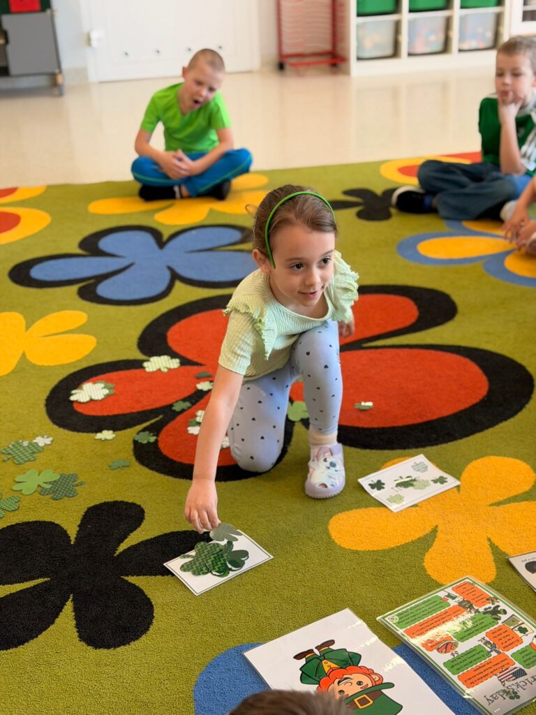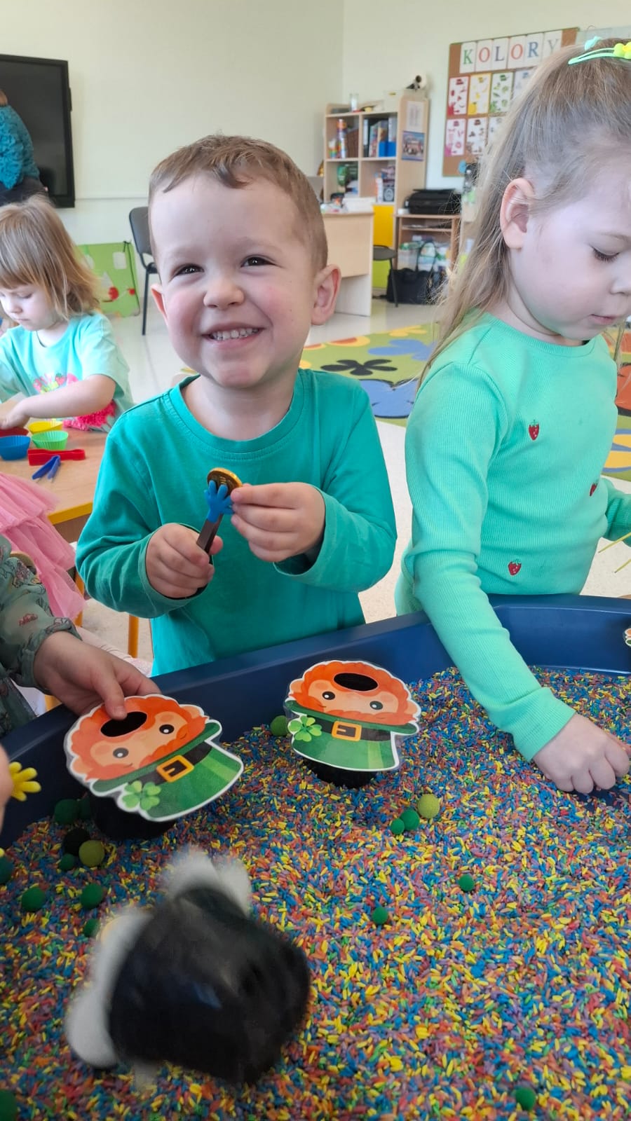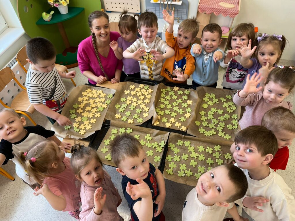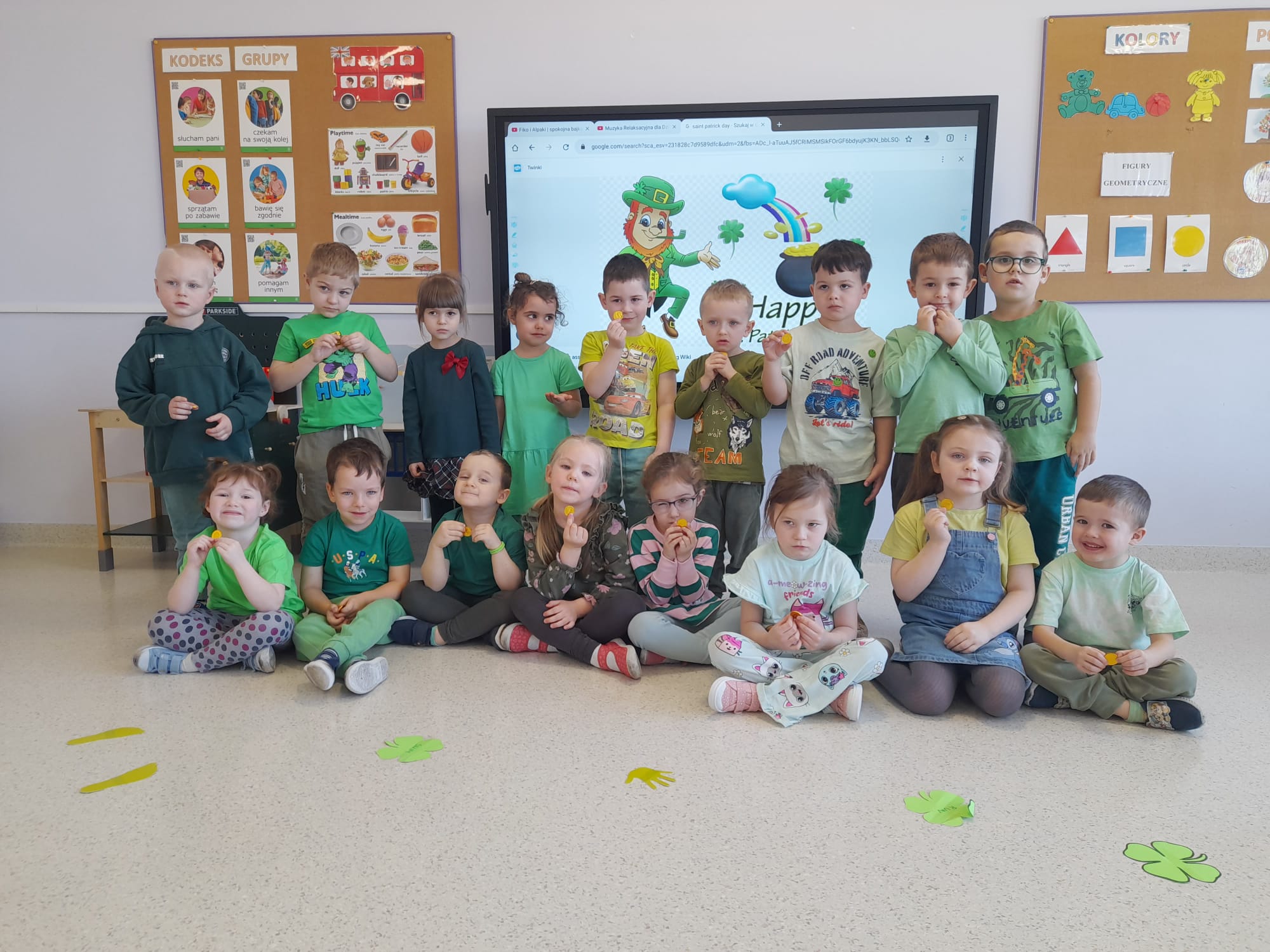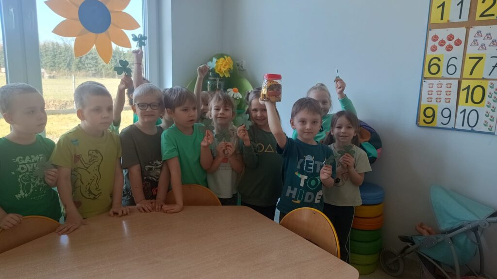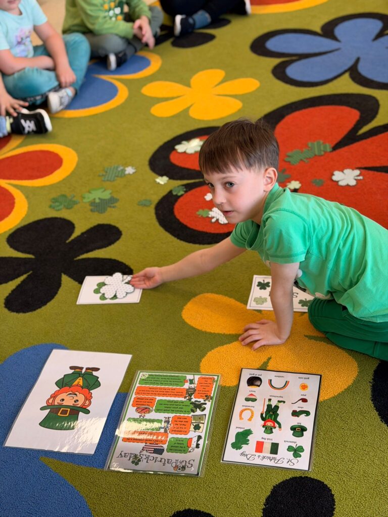 Dziś w przedszkolu wszystko jest zielone! W ramach innowacji Play with English przenieśliśmy się do jednego z najbardziej zielonych państw i świętowaliśmy Dzień Świętego Patryka. Dzieci poznały historię patrona Irlandii i symbole kraju. Szukały także złotych monet skrzata Leprechauna schowanych na końcu tęczy.