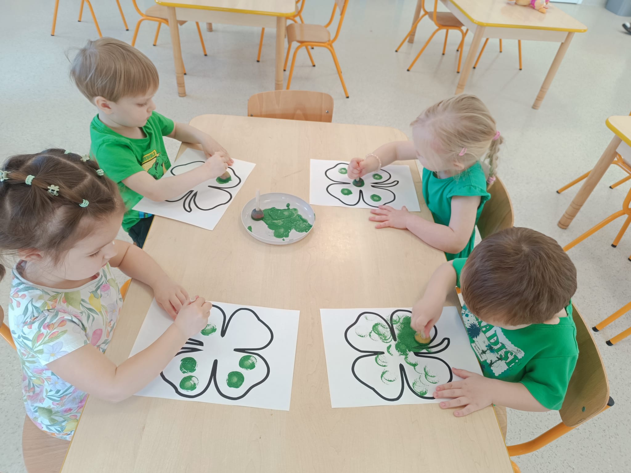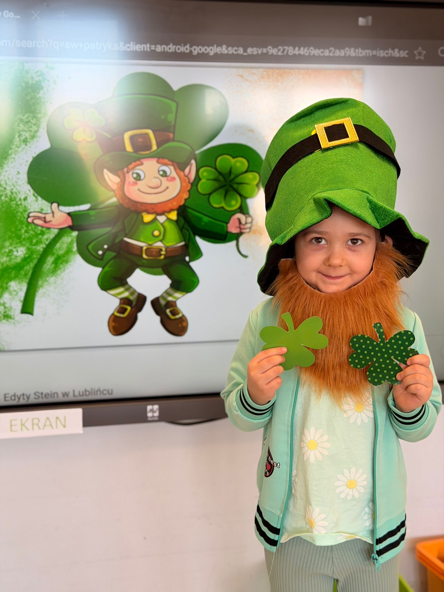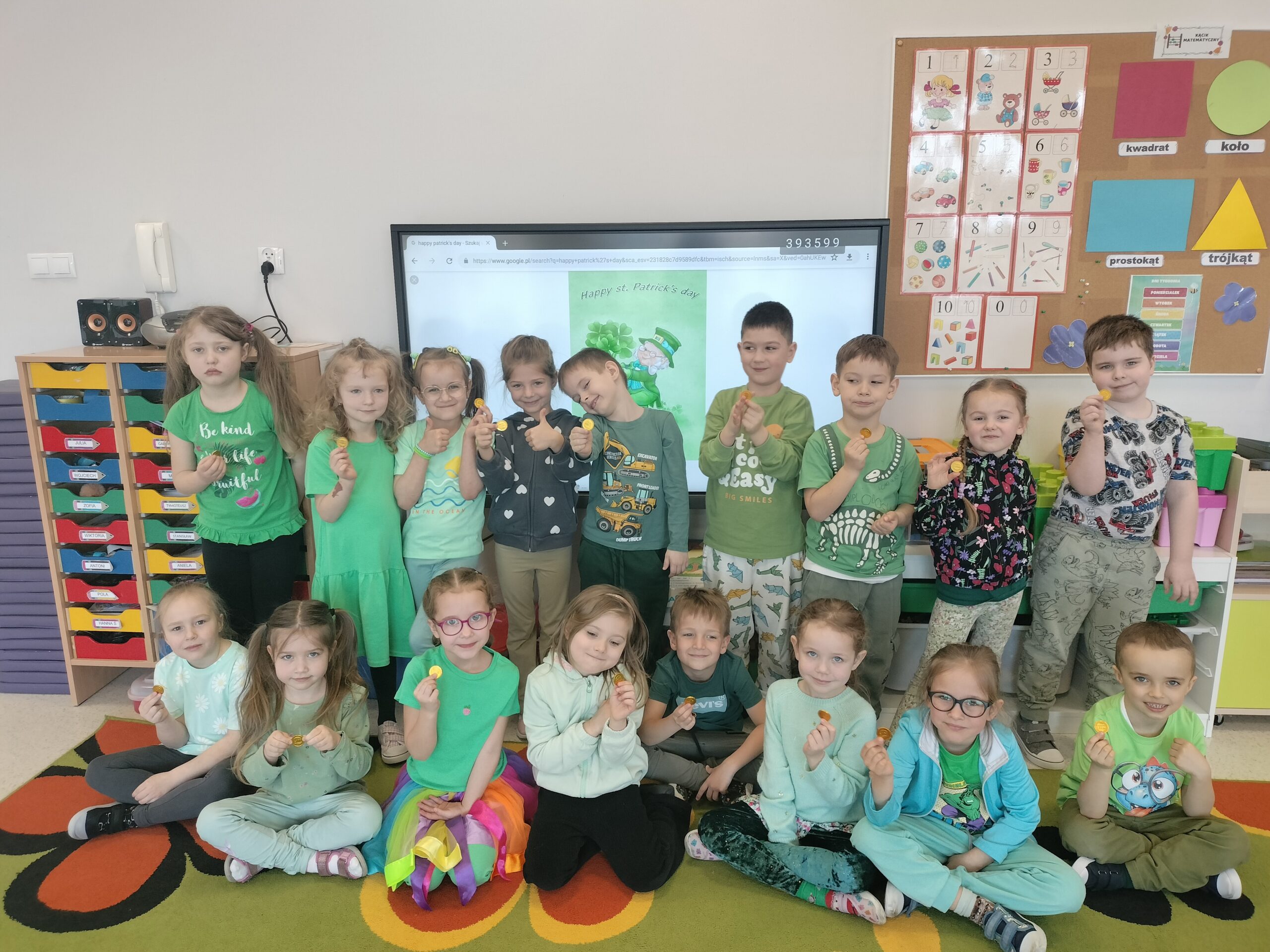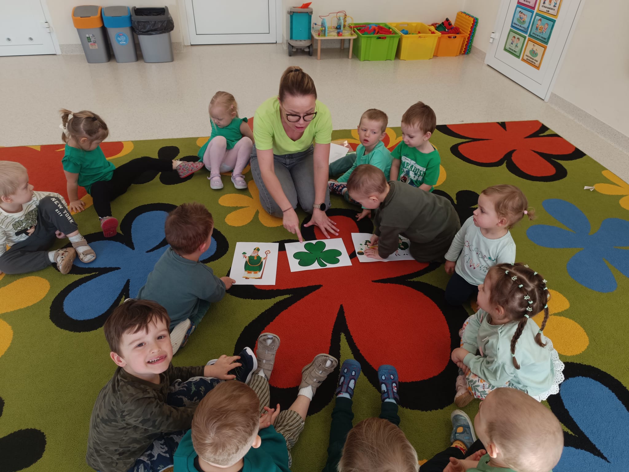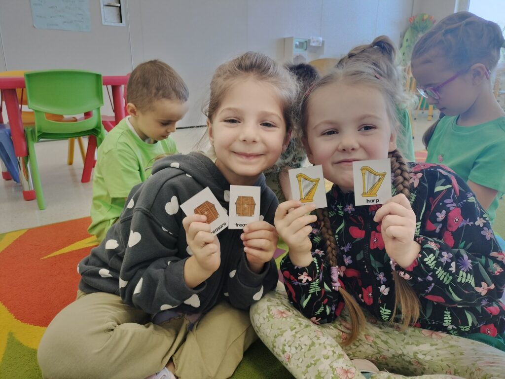 Dziś w przedszkolu wszystko jest zielone! W ramach innowacji Play with English przenieśliśmy się do jednego z najbardziej zielonych państw i świętowaliśmy Dzień Świętego Patryka. Dzieci poznały historię patrona Irlandii i symbole kraju. Szukały także złotych monet skrzata Leprechauna schowanych na końcu tęczy.